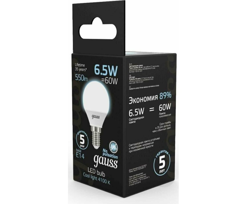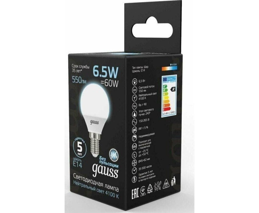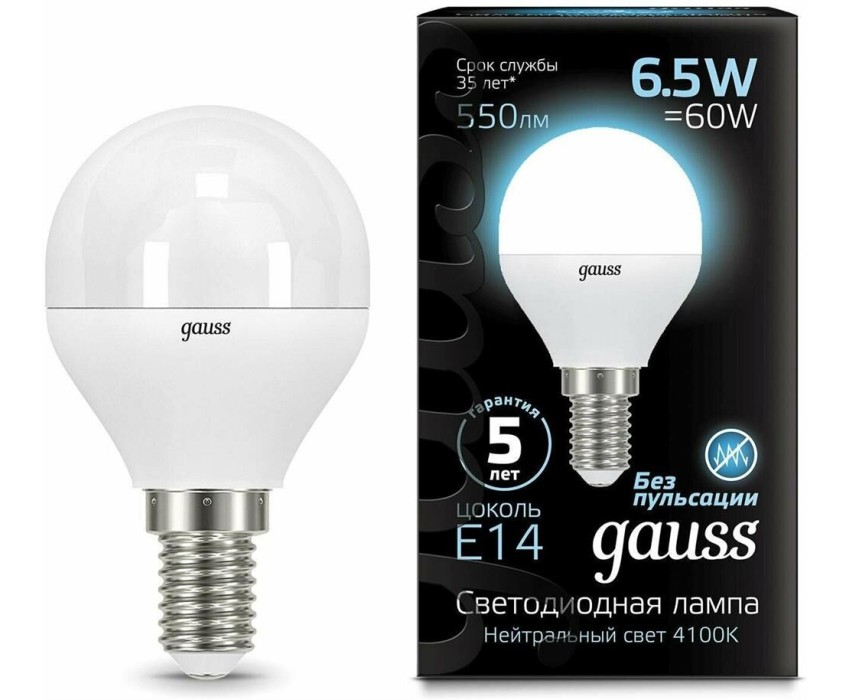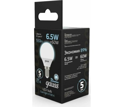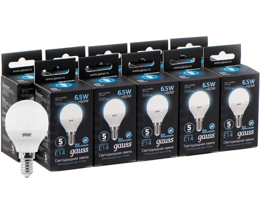 GAUSS Лампа светодиодная Elementary 10Вт цок.:E14 шар 220B 4100K св.свеч.бел.нейт. (упак.:10шт) (53120)
