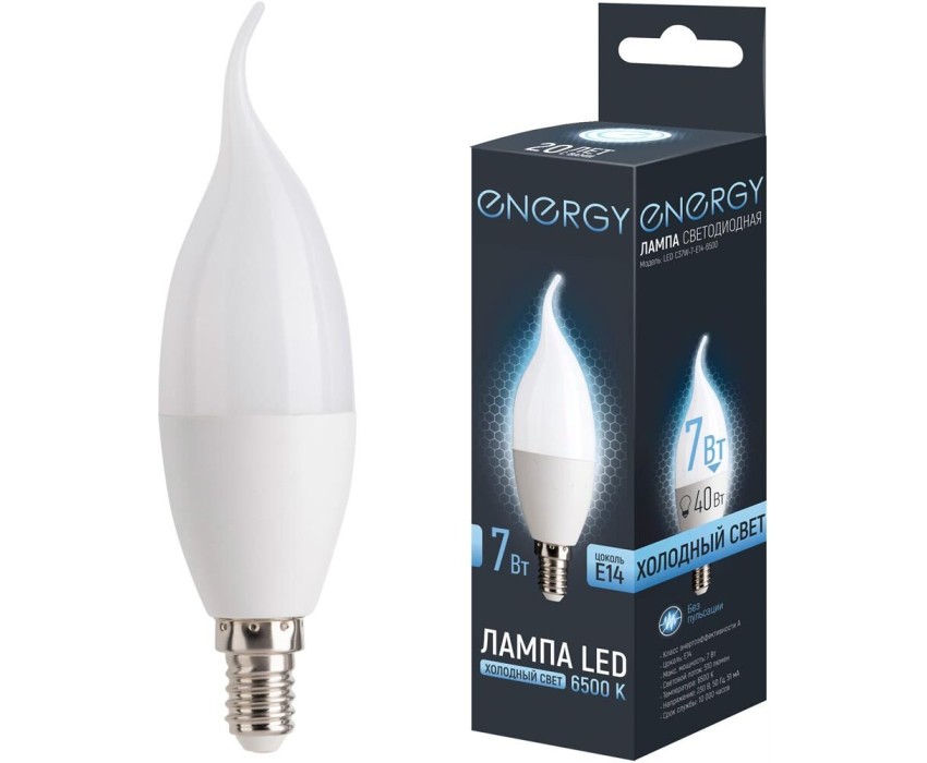 Лампа светодиодная Energy LED С37W-7-E14-6500 Цоколь E14 Световой поток 510 люмен Срок службы 10 000 часов Цветовая температура 6500 К (холодный свет) Класс энергоэффективности А Без пульсации Напряжение 230 В, 50 Гц Диаметр 3,8 см Высота 12,5 см Мощность аналога лампы накаливания 40 Вт Мощность 7 Вт