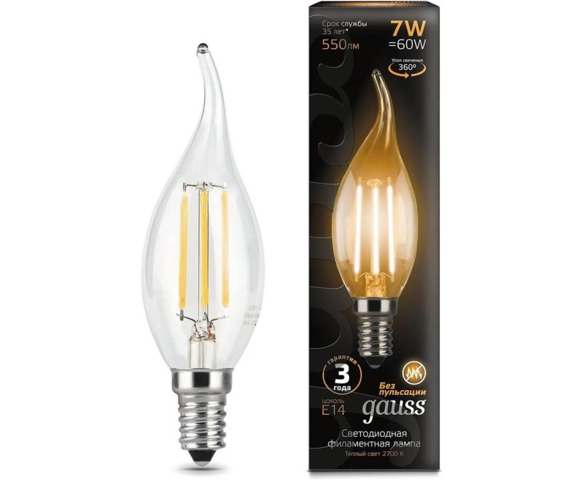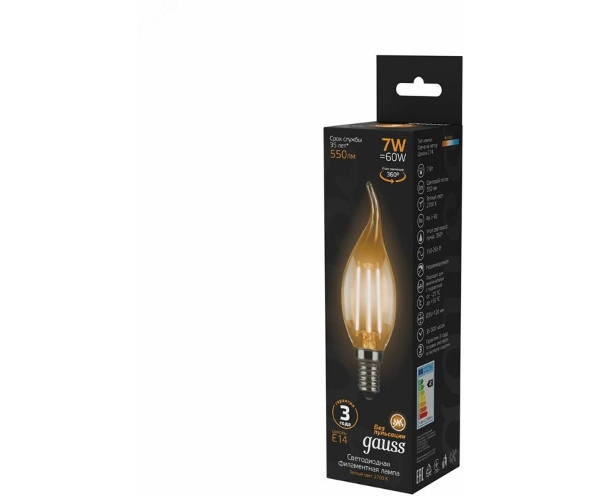 Тип товара: светодиодная. Мощность: 7. Световой поток: 550. Максимальный срок службы: 35000. Напряжение питания: 220. Патрон: E14. Колба: CF35. Угол светового пучка: 360. Класс энергоэффективности: A+. Форма лампы: свеча на ветру. Габариты упаковки (ед) ДхШхВ: 0.13x0.04x0.04. Вес упаковки (ед): 0.03. Диммеруемая: нет. Цветовая температура: 2700. Индекс цветопередачи: 90. Цвет свечения: белый теплый. Тип лампы: светодиодная. Степень защиты: IP20. Гарантия: 24 мес.. Количество ламп: одна шт.. Цоколь: E14. Форма: свеча на ветру. Параметры: 550 lm. Напряжение: 220 В. Количество ламп: одна шт. Угол светового пучка: 360 °. Мощность: 7 Вт