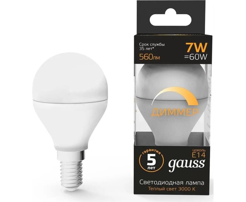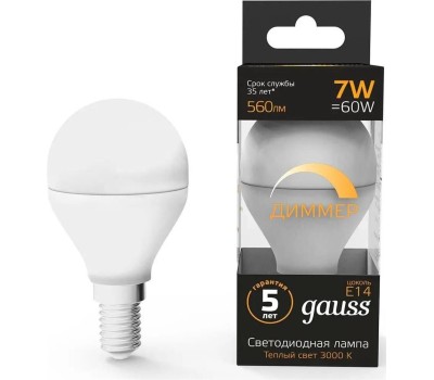 Тип товара: светодиодная. Мощность: 7. Световой поток: 560. Максимальный срок службы: 35000. Напряжение питания: 220. Патрон: E14. Угол светового пучка: 240. Матовая: да. Форма лампы: шар. Габариты упаковки (ед) ДхШхВ: 0.09x0.055x0.11. Вес упаковки (ед): 0.06. Диммеруемая: да. Цветовая температура: 3000. Цвет свечения: белый теплый. Тип лампы: светодиодная. Степень защиты: IP20. Гарантия: 24 мес.. Количество ламп: одна шт.. Форма: шар. Количество ламп: одна шт. Угол светового пучка: 240 °. Мощность: 7 Вт. Параметры: 560 lm. Цоколь: E14. Напряжение: 220 В