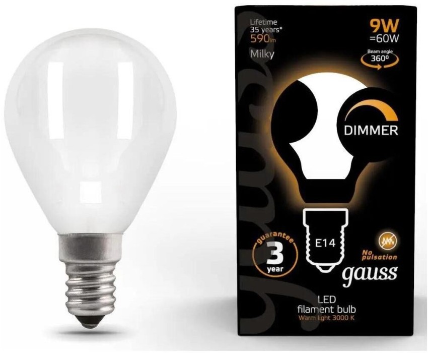 Тип товара: светодиодная Бренд: GAUSS Модель: 105201109-D PartNumber/Артикул Производителя: 105201109-D Световой поток: 590 lm Максимальный срок службы: 35000 ч Угол светового пучка: 360 ° Энергосберегающая: ДА Матовая: ДА Класс энергоэффективности: A+ Серия: Filament Количество ламп: 10 шт Патрон: E14 Цветовая температура: 3000 К Диммер: ДА Цвет свечения: белый теплый Индекс цветопередачи: 90 Тип лампы: светодиодная Степень защиты: IP20 Мощность: 9 Вт Вес упаковки (ед): 0.316 кг Габариты упаковки (ед) ДхШхВ: 0.24x0.18x0.045 м Объем упаковки (ед): 0.001944 м3 Напряжение питания: 220 В