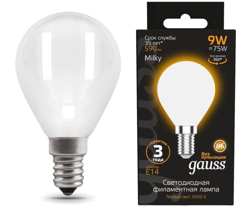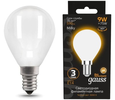 GAUSS Лампа светодиодная Filament 105201109 9Вт цок.:E14 шар 220B св.свеч.бел.теп. (упак.:10шт)
