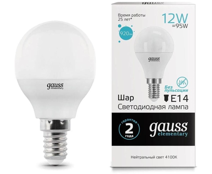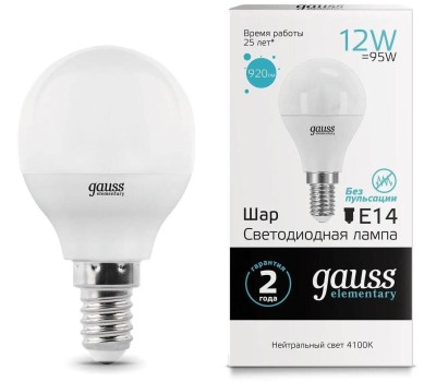 GAUSS Лампа светодиодная Elementary 12Вт цок.:E14 шар 220B св.свеч.бел.нейт. (упак.:10шт) (53122)