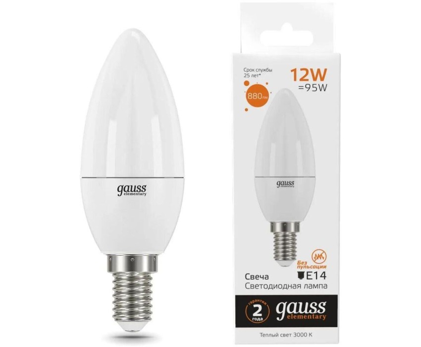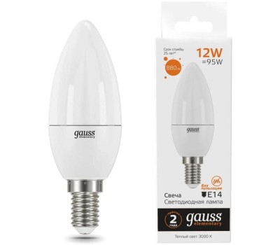 GAUSS Лампа светодиодная Elementary 12Вт цок.:E14 свеча 220B св.свеч.бел.теп. C37 (упак.:10шт) (33112)