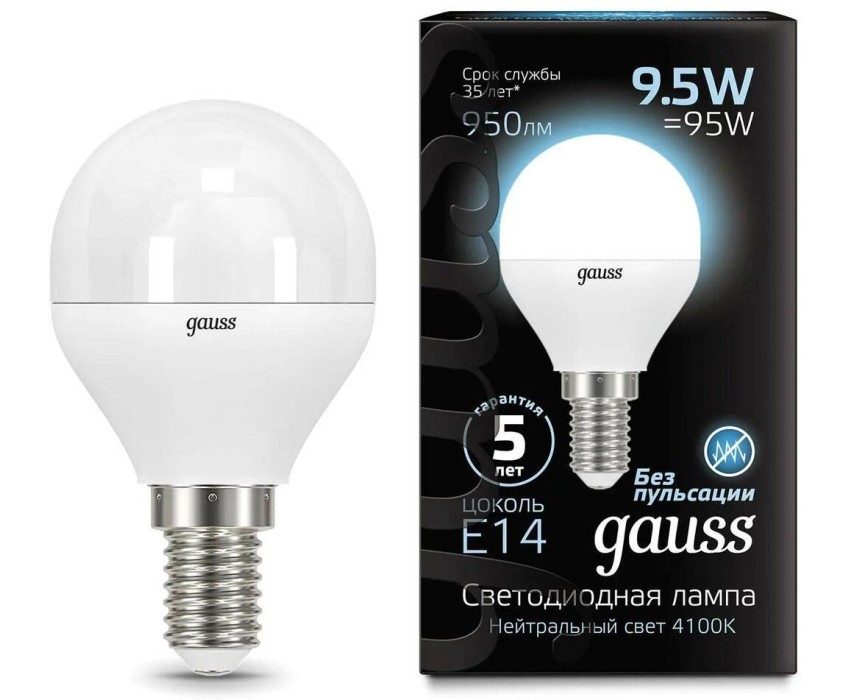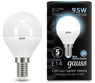 GAUSS Лампа светодиодная 9.5Вт цок.:E14 шар 220B св.свеч.бел.нейт. (упак.:10шт) (105101210)