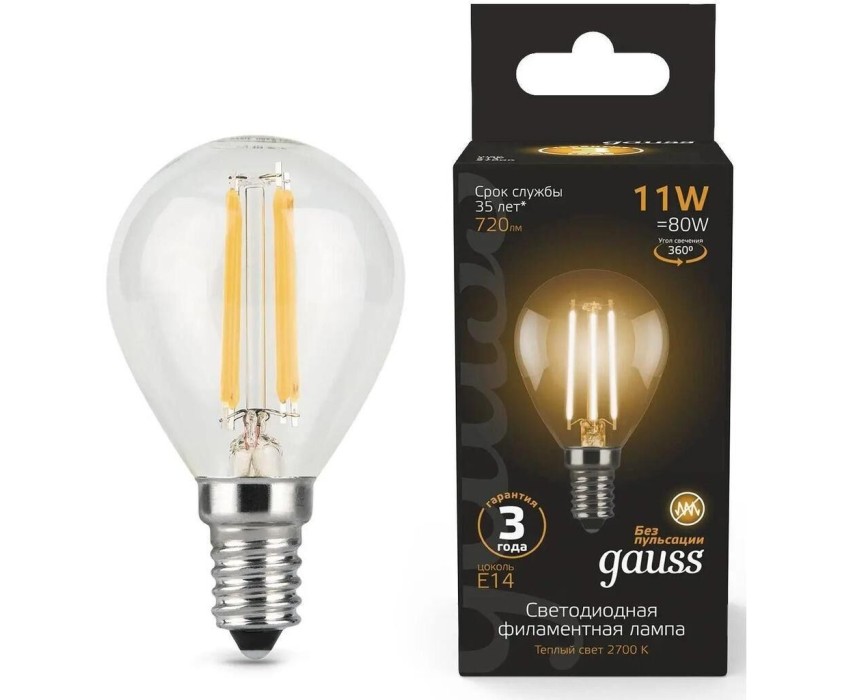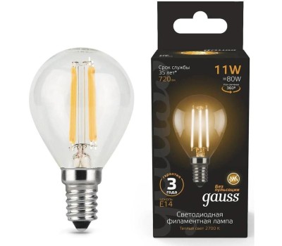 GAUSS Лампа светодиодная Filament 11Вт цок.:E14 шар 220B св.свеч.бел.теп. (упак.:10шт) (105801111)