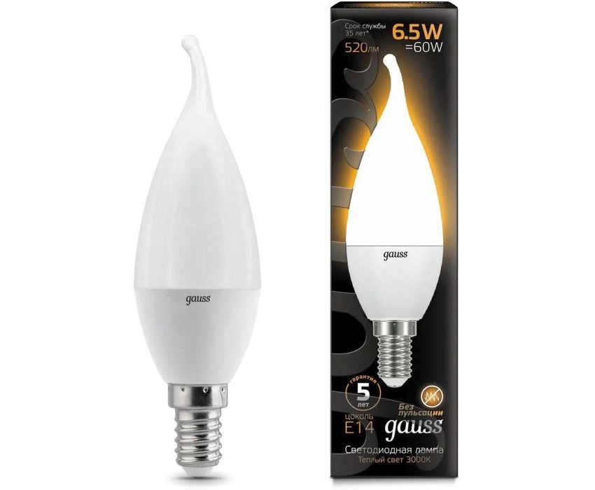 GAUSS Лампа светодиодная 6.5Вт цок.:E14 свеча 220B св.свеч.бел.теп. (упак.:10шт) (104101107)