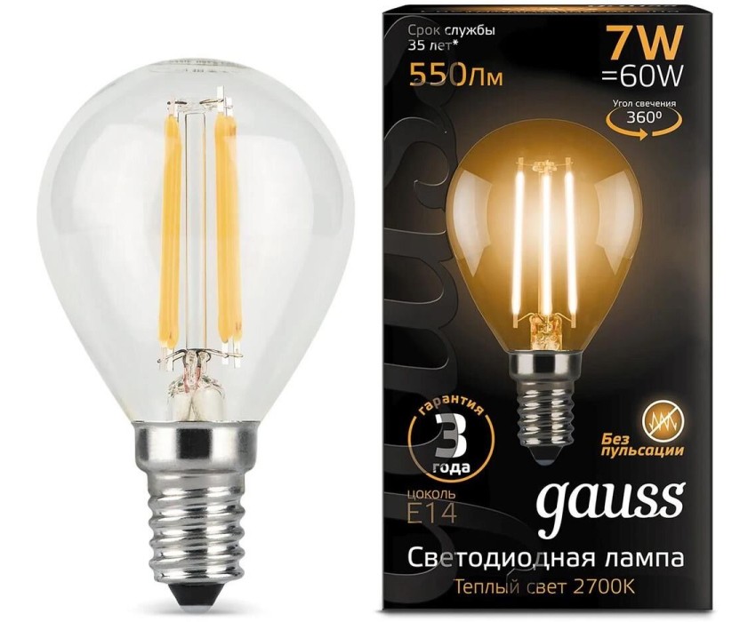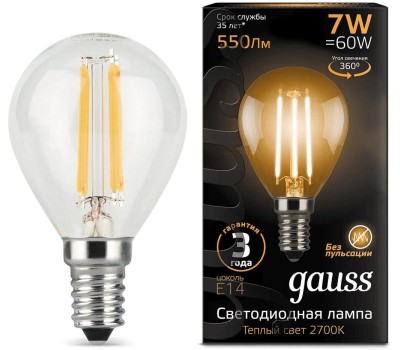 GAUSS Лампа светодиодная 7Вт цок.:E14 шар 220B св.свеч.бел.теп. P45 (упак.:10шт) (105801107)