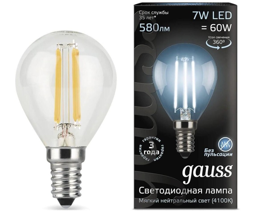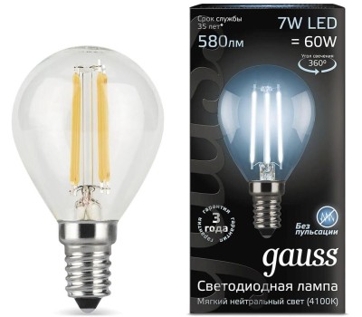 GAUSS Лампа светодиодная Filament 7Вт цок.:E14 шар 220B св.свеч.бел.нейт. P45 (упак.:10шт) (105801207)