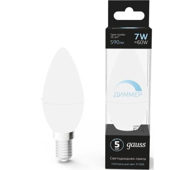 Бренд: GAUSS Тип товара: светодиодная PartNumber/Артикул Производителя: 103101207-D Матовая: ДА Световой поток: 590 lm Максимальный срок службы: 35000 ч Угол светового пучка: 240 ° Патрон: E14 Количество ламп: 1 шт Цветовая температура: 4100 К Диммер: ДА Цвет свечения: белый нейтральный Тип лампы: светодиодная Степень защиты: IP20 Мощность: 7 Вт Напряжение питания: 220 В Габариты упаковки (ед) ДхШхВ: 0.125x0.045x0.045 м Вес упаковки (ед): 0.062 кг Объем упаковки (ед): 0.000253125 м3