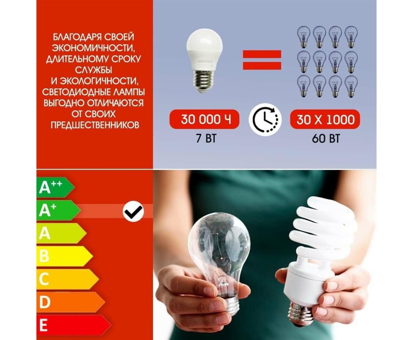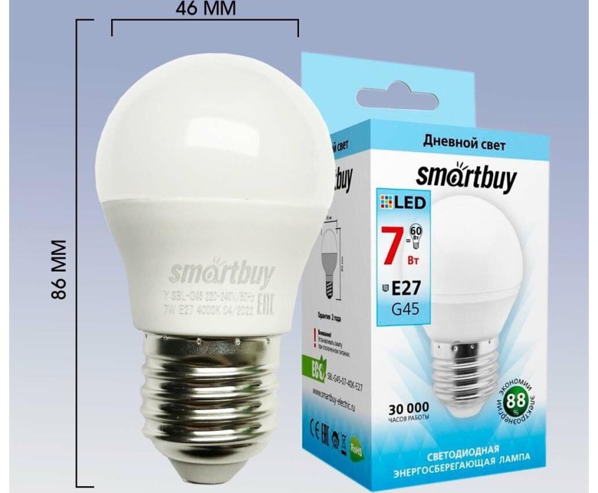 Характеристики SBL-G45-7-40K-E27 Мощность, Вт 7 Аналог лампы накаливания 60 Высота, мм 80 Диаметр, мм 45 Диапазон рабочих температур - 25..+50°C Индекс цветопередачи, CRI Ra>80 Материал Пластик+металл Колба Матовая Напряжение, В 220-240 В Световой поток, лм 550 Светоотдача 80 Совместимость с выключателем с подсветкой нет Срок службы 2 года Форма колбы шар Цветовая температура, К 4000 Тип цоколя Е27