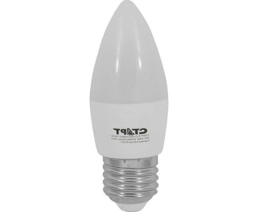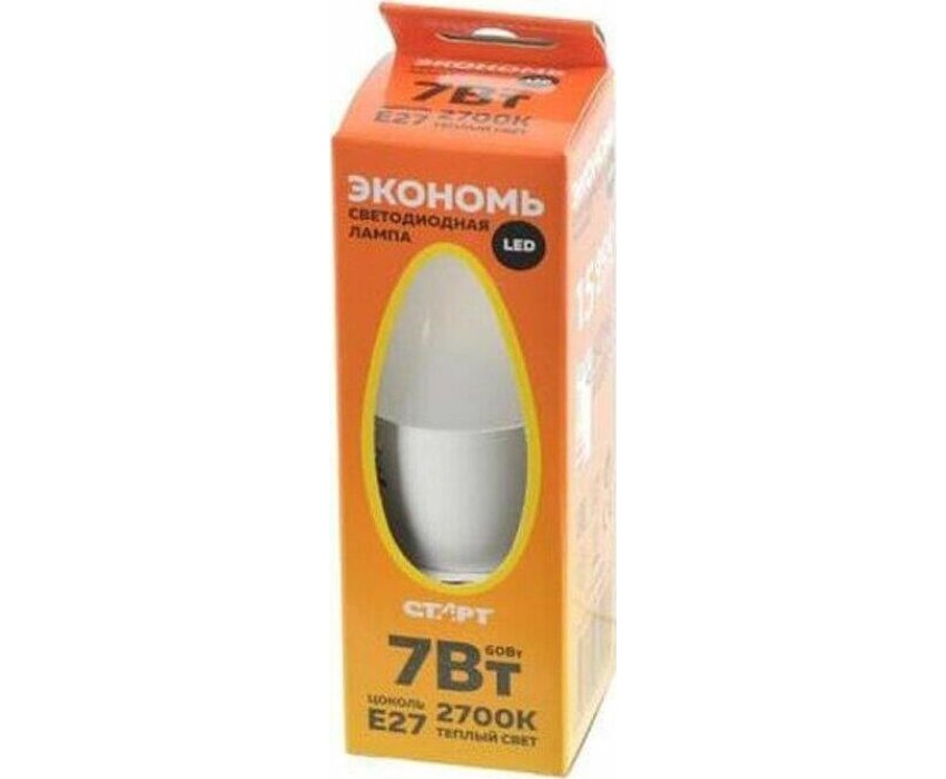 Светодиодная лампа. Форма - свеча. Теплый белый свет. Потребляемая мощность 7 Вт. Цоколь Е27. Световой поток 560 Лм.