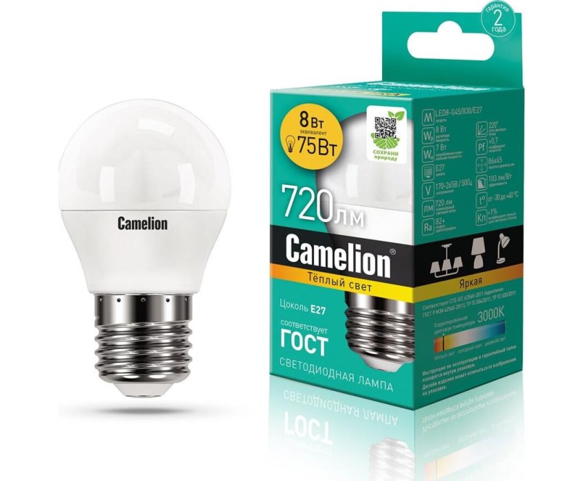 Лампа светодиодная CAMELION (12392) LED8-G45/830/E27