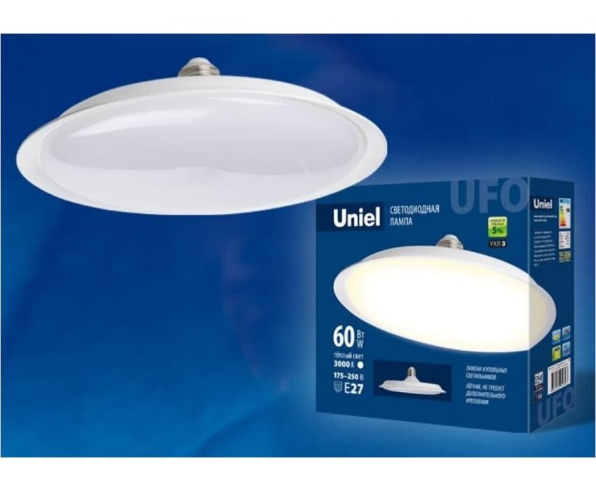Входное напряжение, В - 175-250; Высота изделия, мм - 80; Диапазон рабочих температур, °С - от -20 до +40; Индекс цветопередачи, Ra - ?80; Класс энергопотребления - A+; Коэффициент мощности - ?0,7; Материал корпуса (изделия) - термопластик; Минимальная партия - 1; Мощность, Вт - 60; Свет - теплый белый; Световой поток, Лм - 4800; Светоотдача, Лм/Вт - ?80; Срок гарантии, мес. - 24 месяца; Срок годности - не ограничен; Срок службы, ч - 25000; Тип стекла - матовое; Угол светового потока, ° - 120; Цветовая температура, К - 3000; Цоколь - Е27; Частота, Гц - 50; Ширина изделия, мм - 270; Эквивалентная мощность лампы накаливания, Вт - 480