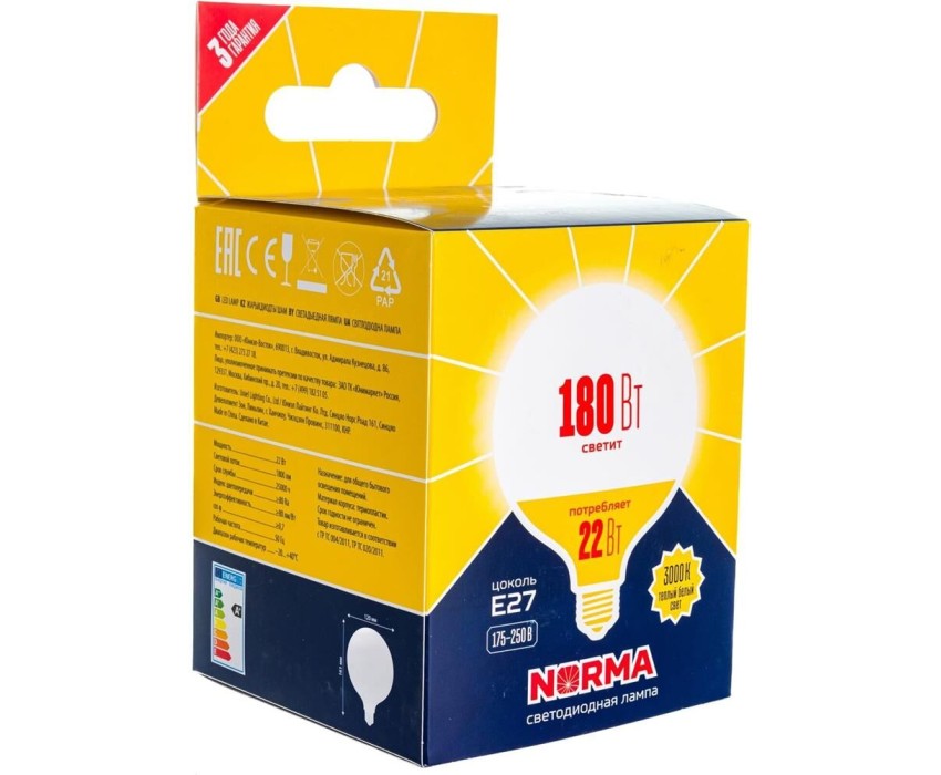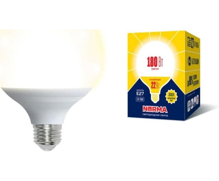 Вес изделия, гр. - 185; Входное напряжение, В - 175-250; Высота изделия, мм - 161; Группа эффективности - Оборотный товар; Диаметр лампы, мм - 120; Диапазон рабочих температур, °С - от -20 до +40; Длина изделия, мм - 120; Индекс цветопередачи, Ra - 80; Класс энергопотребления - A+; Коэффициент мощности - 0,7; Материал корпуса (изделия) - термопластик; Минимальная партия - 1; Мощность, Вт - 22; Свет - теплый белый; Световой поток, Лм - 1800; Светоотдача, Лм/Вт - 80; Срок гарантии, мес. - 36 месяцев; Срок годности - не ограничен; Срок службы, ч - 25000; Страна производства - Китай; Тип стекла - матовое; Угол светового потока, ° - 240; Цветовая температура, К - 3000; Цоколь - Е27; Частота, Гц - 50; Ширина изделия, мм - 120; Эквивалентная мощность лампы накаливания, Вт - 180