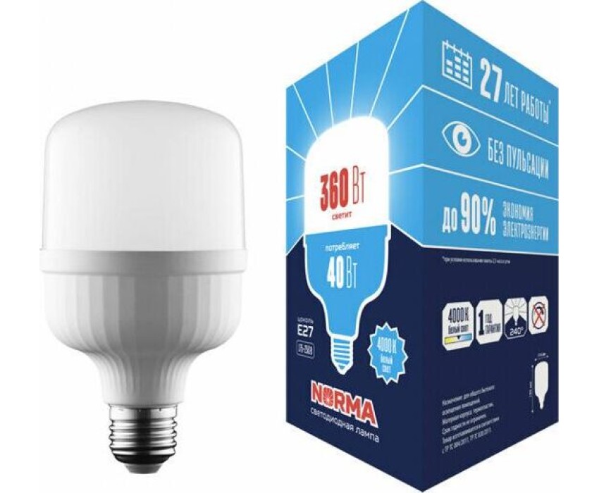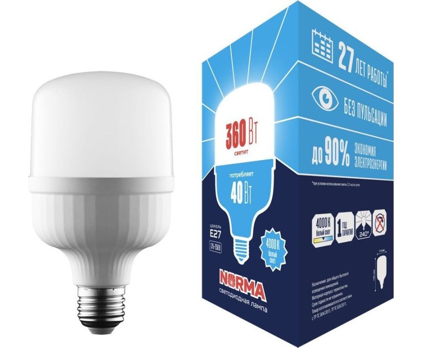 Вес изделия, гр. - 150; Входное напряжение, В - 175-250; Высота изделия, мм - 195; Группа эффективности - Оборотный товар; Диаметр лампы, мм - 114; Диапазон рабочих температур, °С - от -20 до +40; Длина изделия, мм - 114; Индекс цветопередачи, Ra - 80; Класс энергопотребления - A+; Коэффициент мощности - 0,9; Материал корпуса (изделия) - термопластик; Минимальная партия - 1; Мощность, Вт - 40; Свет - белый; Световой поток, Лм - 3 600; Светоотдача, Лм/Вт - 90; Срок гарантии, мес. - 12 месяцев; Срок годности - не ограничен; Срок службы, ч - 25000; Страна производства - Китай; Угол светового потока, ° - 240; Цветовая температура, К - 4000; Цоколь - Е27; Частота, Гц - 50; Ширина изделия, мм - 114; Эквивалентная мощность лампы накаливания, Вт - 360