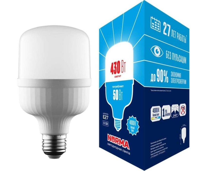 Вес изделия, гр. - 230; Входное напряжение, В - 175-250; Высота изделия, мм - 228; Группа эффективности - Оборотный товар; Диаметр лампы, мм - 125; Диапазон рабочих температур, °С - от -20 до +40; Длина изделия, мм - 125; Индекс цветопередачи, Ra - 80; Класс энергопотребления - A+; Коэффициент мощности - 0,9; Материал корпуса (изделия) - термопластик; Минимальная партия - 1; Мощность, Вт - 50; Свет - белый; Световой поток, Лм - 4 300; Светоотдача, Лм/Вт - 85; Срок гарантии, мес. - 12 месяцев; Срок годности - не ограничен; Срок службы, ч - 25000; Страна производства - Китай; Угол светового потока, ° - 240; Цветовая температура, К - 4000; Цоколь - Е27; Частота, Гц - 50; Ширина изделия, мм - 125; Эквивалентная мощность лампы накаливания, Вт - 430