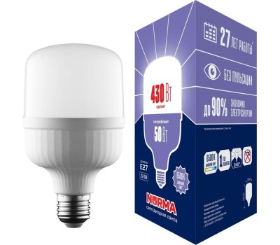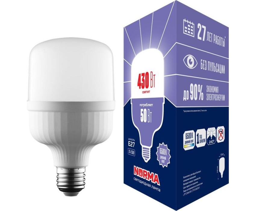 Вес изделия, гр. - 230; Входное напряжение, В - 175-250; Высота изделия, мм - 228; Группа эффективности - Оборотный товар; Диаметр лампы, мм - 125; Диапазон рабочих температур, °С - от -20 до +40; Длина изделия, мм - 125; Индекс цветопередачи, Ra - 80; Класс энергопотребления - A+; Коэффициент мощности - 0,9; Материал корпуса (изделия) - термопластик; Минимальная партия - 1; Мощность, Вт - 50; Свет - дневной белый; Световой поток, Лм - 4 300; Светоотдача, Лм/Вт - 85; Срок гарантии, мес. - 12 месяцев; Срок годности - не ограничен; Срок службы, ч - 25000; Страна производства - Китай; Угол светового потока, ° - 240; Цветовая температура, К - 6500; Цоколь - Е27; Частота, Гц - 50; Ширина изделия, мм - 125; Эквивалентная мощность лампы накаливания, Вт - 430