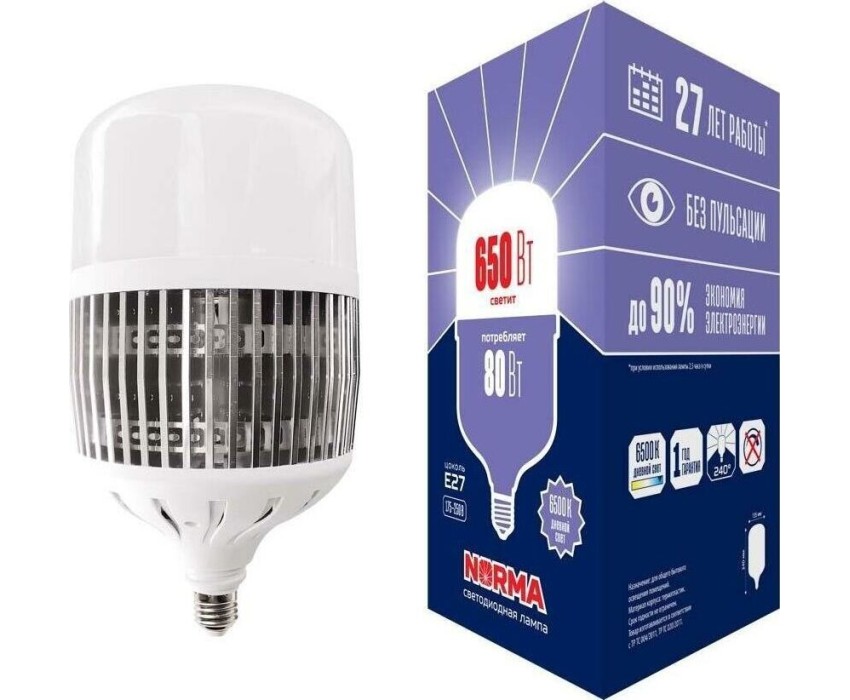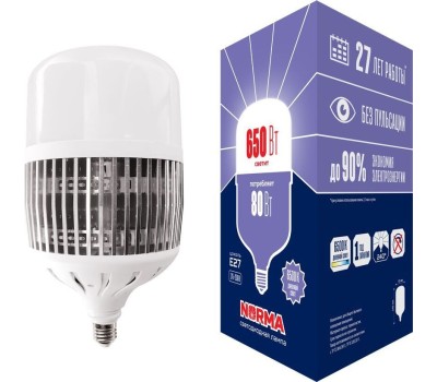 Вес изделия, гр. - 365; Входное напряжение, В - 175-250; Высота изделия, мм - 240; Группа эффективности - Оборотный товар; Диаметр лампы, мм - 135; Диапазон рабочих температур, °С - от -20 до +40; Длина изделия, мм - 135; Индекс цветопередачи, Ra - 80; Класс энергопотребления - A+; Коэффициент мощности - 0,9; Материал корпуса (изделия) - термопластик; Минимальная партия - 1; Мощность, Вт - 80; Свет - дневной белый; Световой поток, Лм - 6 500; Светоотдача, Лм/Вт - 80; Срок гарантии, мес. - 12 месяцев; Срок годности - не ограничен; Срок службы, ч - 25000; Страна производства - Китай; Угол светового потока, ° - 240; Цветовая температура, К - 6500; Цоколь - Е27; Частота, Гц - 50; Ширина изделия, мм - 135; Эквивалентная мощность лампы накаливания, Вт - 650