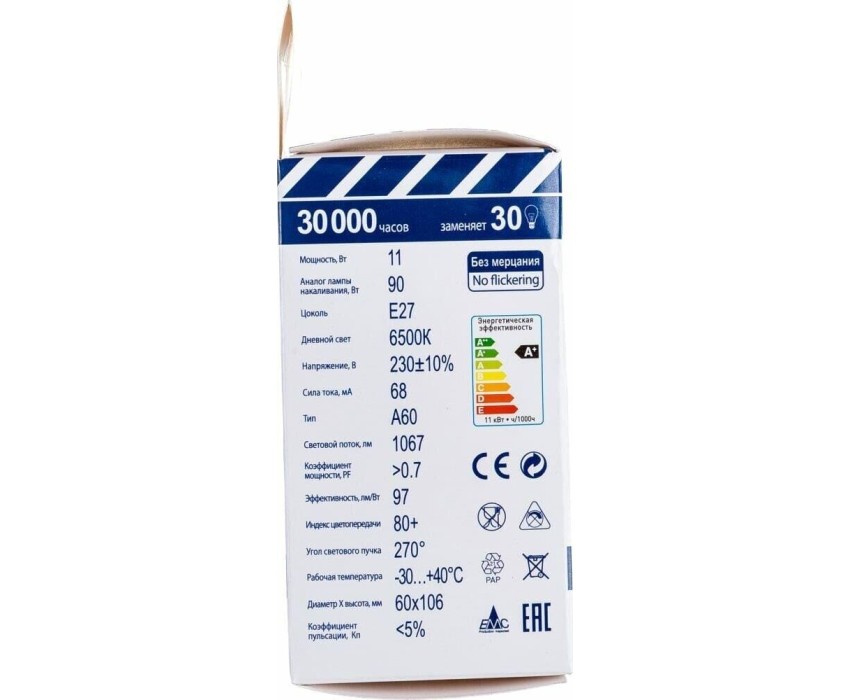 Светодиодная лампа ERGOLUX может быть применена в жилых, офисных и производственных в помещениях, а также в уличных светильниках со степенью защиты не менее IP54. LED лампа, Мощность 11 Вт, Эквивалент лампы накаливания 90 Вт, Цоколь E27, Цветовая температура 6500 К, Световой поток 1067 лм, Угол светового пучка 270, Индекс цветопередачи 80+