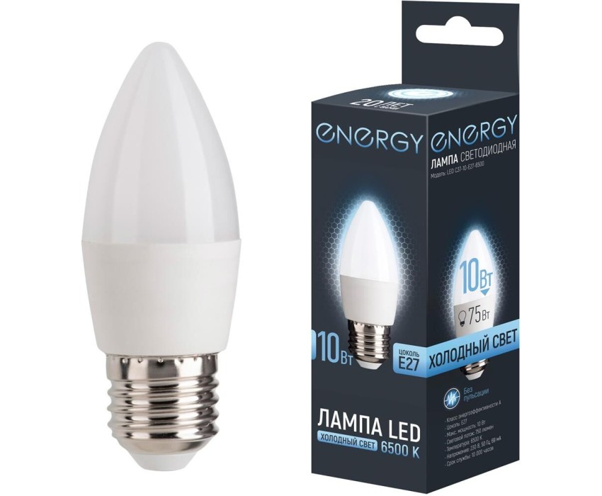 Лампа светодиодная Energy LED С37-10-E27-6500 Цоколь E27 Световой поток 750 люмен Срок службы 10 000 часов Цветовая температура 6500 К (холодный свет) Класс энергоэффективности А Без пульсации Напряжение 230 В, 50 Гц Диаметр 3,8 см Высота 10,9 см Мощность аналога лампы накаливания 75 Вт Мощность 10 Вт