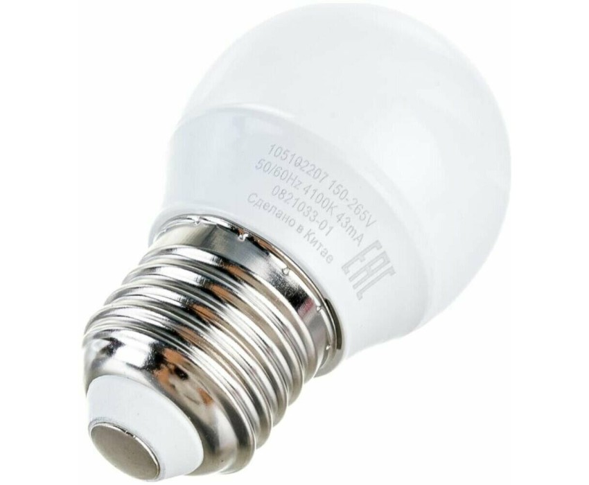 Тип товара: светодиодная. Мощность: 6.5. Световой поток: 550. Максимальный срок службы: 35000. Напряжение питания: 220. Патрон: E27. Колба: P45. Угол светового пучка: 240. Класс энергоэффективности: A+. Матовая: да. Форма лампы: шар. Габариты упаковки (ед) ДхШхВ: 0.23x0.05x0.18. Вес упаковки (ед): 0.4. Страна производства: Китай. Высота: 80. Диаметр: 45. Диммеруемая: нет. Цветовая температура: 4100. Индекс цветопередачи: 90. Цвет: белый. Цвет свечения: белый нейтральный. Тип лампы: светодиодная. Степень защиты: IP20. Гарантия: 24 мес.. Количество ламп: 10 шт.. Параметры: 550 lm. Форма: шар. Количество ламп: 10 шт. Напряжение: 220 В. Цоколь: E27. Угол светового пучка: 240 °. Мощность: 6.5 Вт