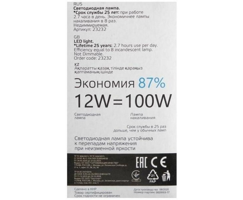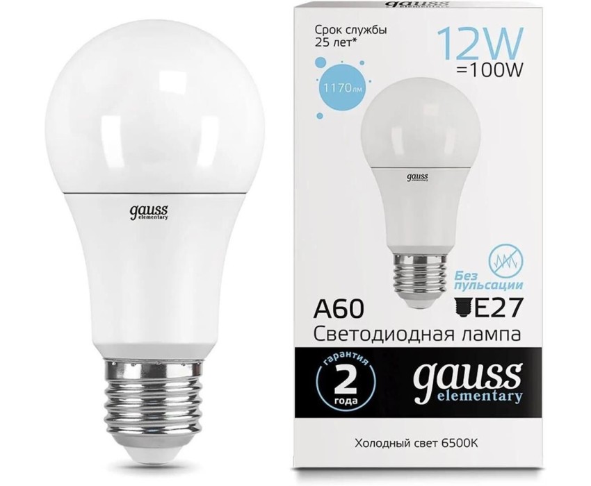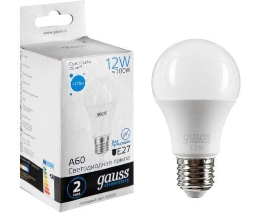 Тип товара: светодиодная. Мощность: 12. Световой поток: 1170. Максимальный срок службы: 25000. Напряжение питания: 220. Патрон: E27. Колба: A60. Угол светового пучка: 240. Класс энергоэффективности: A+. Матовая: да. Форма лампы: груша. Габариты упаковки (ед) ДхШхВ: 0.3x0.22x0.06. Вес упаковки (ед): 0.52. Диммеруемая: нет. Цветовая температура: 6500. Индекс цветопередачи: 80. Цвет свечения: белый холодный. Тип лампы: светодиодная. Степень защиты: IP20. Гарантия: 24 мес.. Количество ламп: 10 шт.. Мощность: 12 Вт. Угол светового пучка: 240 °. Параметры: 1170 lm. Напряжение: 220 В. Форма: груша. Цоколь: E27. Количество ламп: 10 шт