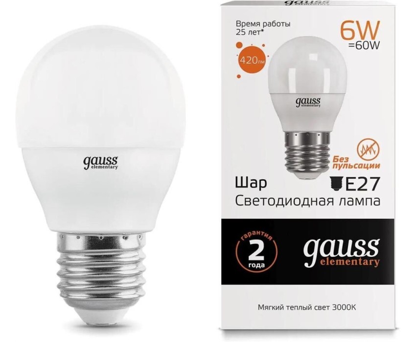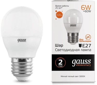 Тип товара: светодиодная. Мощность: 6. Световой поток: 420. Максимальный срок службы: 25000. Напряжение питания: 220. Патрон: E27. Угол светового пучка: 240. Класс энергоэффективности: A+. Матовая: да. Форма лампы: шар. Габариты упаковки (ед) ДхШхВ: 0.23x0.045x0.16. Вес упаковки (ед): 0.35. Диммеруемая: нет. Цветовая температура: 3000. Индекс цветопередачи: 80. Цвет свечения: белый теплый. Тип лампы: светодиодная. Степень защиты: IP20. Гарантия: 24 мес.. Количество ламп: 10 шт.. Мощность: 6 Вт. Параметры: 420 lm. Форма: шар. Количество ламп: 10 шт. Угол светового пучка: 240 °. Напряжение: 220 В. Цоколь: E27
