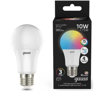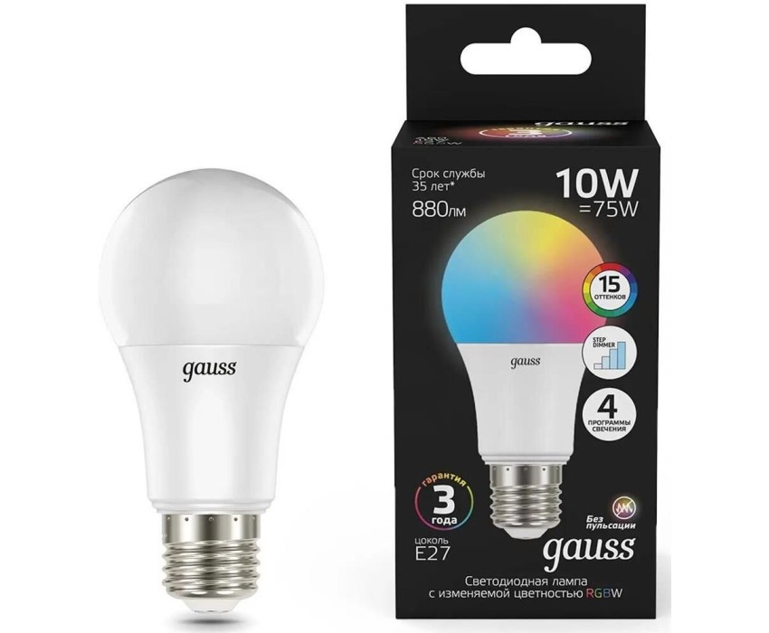 Тип товара: светодиодная. Мощность: 10. Световой поток: 880. Максимальный срок службы: 35000. Напряжение питания: 220. Патрон: E27. Колба: A60. Угол светового пучка: 240. Класс энергоэффективности: A+. Матовая: да. Форма лампы: груша. Габариты упаковки (ед) ДхШхВ: 0.064x0.064x0.145. Вес упаковки (ед): 0.07. Диммеруемая: да. Индекс цветопередачи: 89. Цвет свечения: RGB. Тип лампы: светодиодная. Степень защиты: IP20. Гарантия: 12 мес.. Количество ламп: одна шт.. Мощность: 10 Вт. Цоколь: E27. Количество ламп: одна шт. Форма: груша. Напряжение: 220 В. Угол светового пучка: 240 °. Параметры: 880 lm