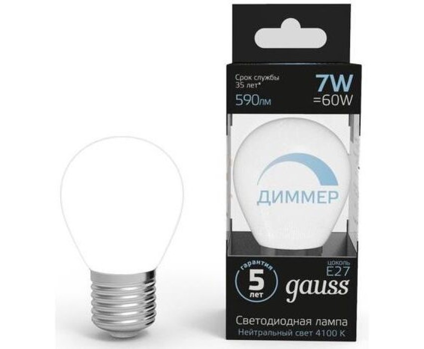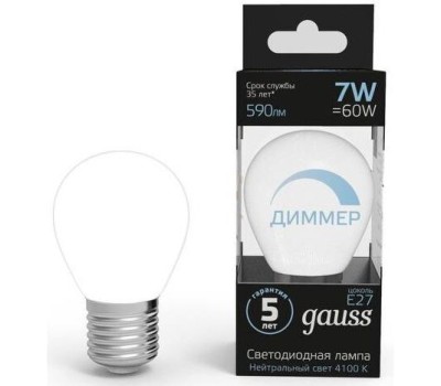 Тип товара: светодиодная. Мощность: 7. Световой поток: 590. Максимальный срок службы: 35000. Напряжение питания: 220. Патрон: E27. Матовая: да. Форма лампы: шар. Габариты упаковки (ед) ДхШхВ: 0.12x0.05x0.05. Вес упаковки (ед): 0.06. Диммеруемая: да. Цветовая температура: 4100. Индекс цветопередачи: 90. Цвет свечения: белый нейтральный. Тип лампы: светодиодная. Степень защиты: IP20. Гарантия: 24 мес.. Количество ламп: одна шт.. Мощность: 7 Вт. Цоколь: E27. Количество ламп: одна шт. Форма: шар. Напряжение: 220 В. Параметры: 590 lm