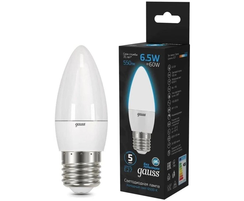 GAUSS Лампа светодиодная 103102307 6.5Вт цок.:E27 свеча 220B св.свеч.бел.хол. (упак.:10шт)