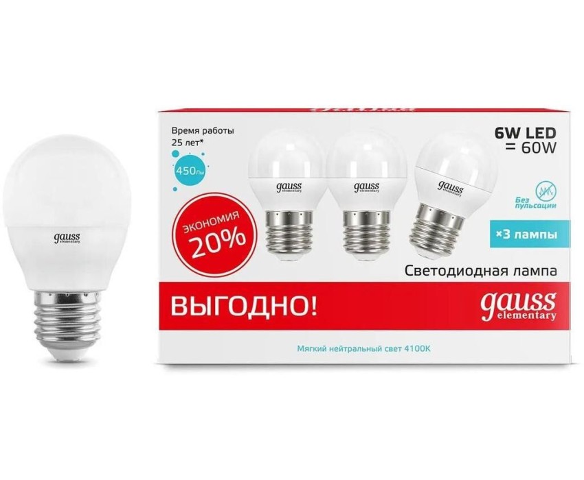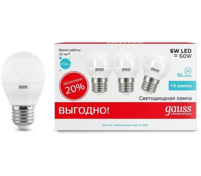 GAUSS Лампа светодиодная Elementary 53226T 6Вт цок.:E27 шар 180B св.свеч.бел.нейт. (упак.:3шт)