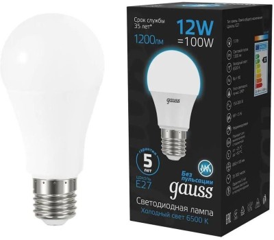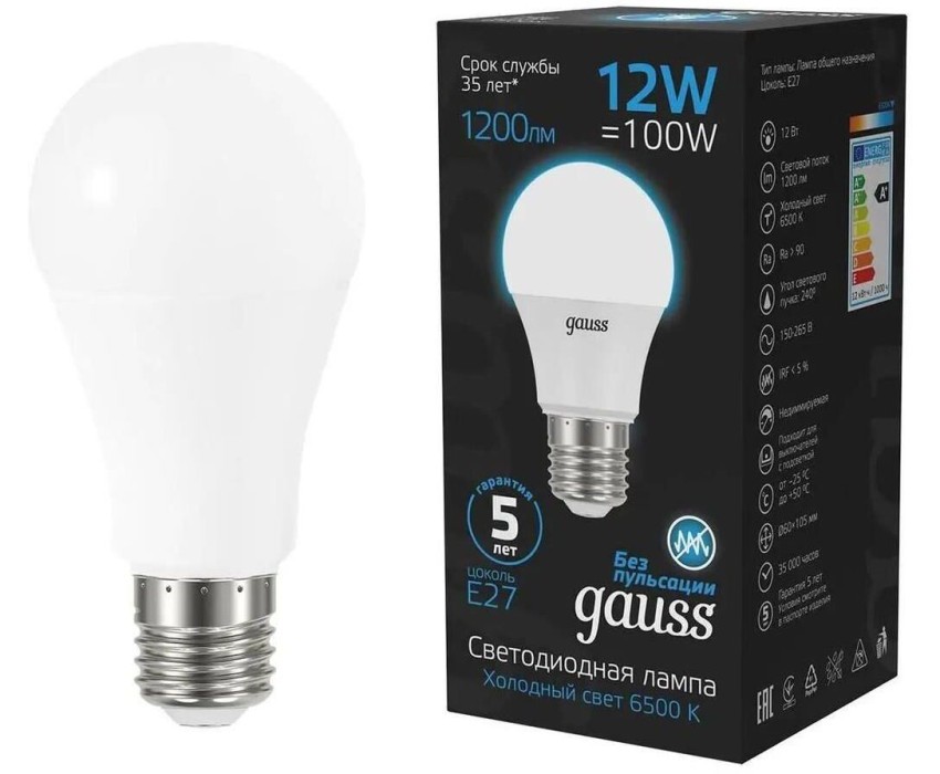 Тип товара: светодиодная Бренд: GAUSS Модель: 102502312 PartNumber/Артикул Производителя: 102502312 Световой поток: 1200 lm Максимальный срок службы: 35000 ч Угол светового пучка: 240 ° Энергосберегающая: ДА Матовая: ДА Класс энергоэффективности: A+ Вес упаковки (ед): 0.6 кг Патрон: E27 Количество ламп: 10 шт Цветовая температура: 6500 К Цвет свечения: белый холодный Индекс цветопередачи: 90 Тип лампы: светодиодная Степень защиты: IP20 Мощность: 12 Вт Напряжение питания: 220 В Объем упаковки (ед): 0.00374355 м3 Габариты упаковки (ед) ДхШхВ: 0.295x0.235x0.054 м