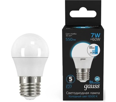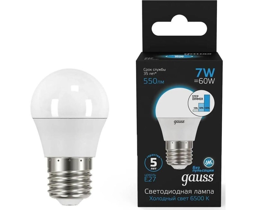 Тип товара: светодиодная Бренд: GAUSS Модель: 105102307-S PartNumber/Артикул Производителя: 105102307-S Световой поток: 550 lm Максимальный срок службы: 35000 ч Угол светового пучка: 240 ° Энергосберегающая: ДА Матовая: ДА Класс энергоэффективности: A+ Патрон: E27 Количество ламп: 10 шт Цветовая температура: 6500 К Диммер: ДА Цвет свечения: белый холодный Индекс цветопередачи: 90 Тип лампы: светодиодная Степень защиты: IP20 Мощность: 7 Вт Напряжение питания: 220 В Габариты упаковки (ед) ДхШхВ: 0.235x0.046x0.165 м Вес упаковки (ед): 0.033 кг Объем упаковки (ед): 0.00178365 м3