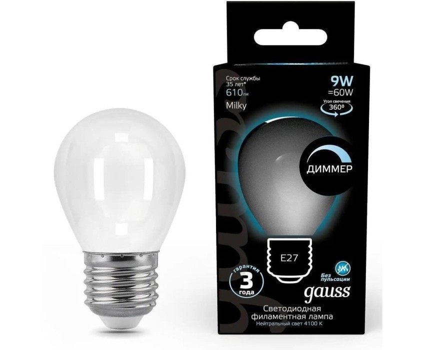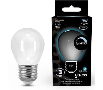 GAUSS Лампа светодиодная Filament 105202209-D 9Вт цок.:E27 шар 220B св.свеч.бел.нейт. (упак.:10шт)