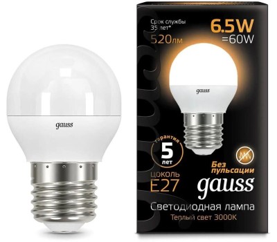GAUSS Лампа светодиодная Black 6.5Вт цок.:E27 шар 220B св.свеч.бел.теп. G45 (упак.:10шт) (105102107)