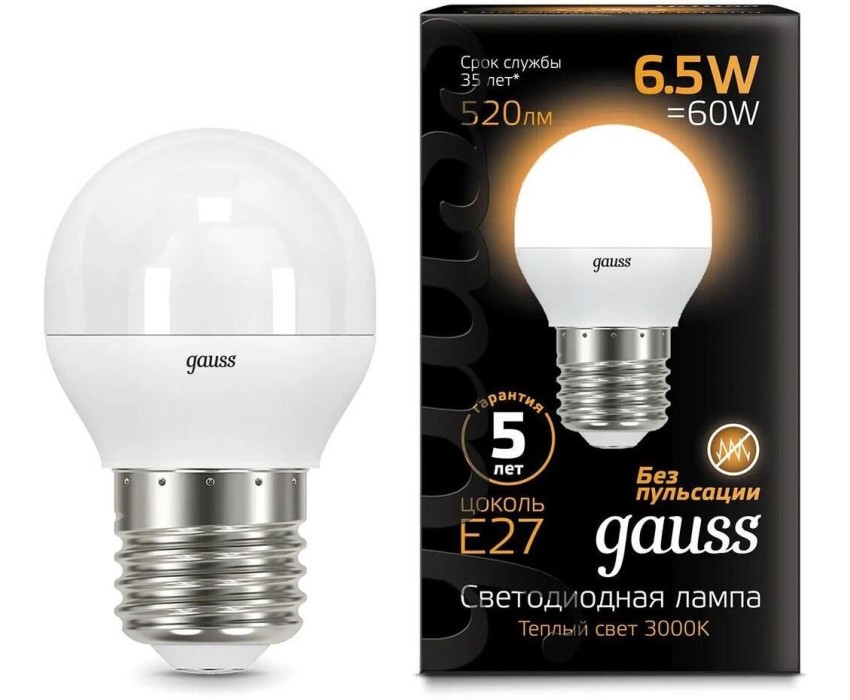 Бренд: GAUSS PartNumber/Артикул Производителя: 105102107 Колба: G45 Световой поток: 520 lm Максимальный срок службы: 35000 ч Угол светового пучка: 240 ° Класс энергоэффективности: A Описание: Светодиодная лампа Gauss - безопасный для здоровья и окружающей среды источник света. Она не пульсирует, мгновенно включается, не содержит ртути и имеет больший срок службы, чем лампы накаливания и КЛЛ, экономичнее ламп накаливания до 10 раз. Тип товара: светодиодная Энергосберегающая: ДА Матовая: ДА Вес упаковки (ед): 0.44 кг Патрон: E27 Серия: Black Количество ламп: 10 шт Цветовая температура: 3000 К Цвет свечения: белый теплый Тип лампы: светодиодная Степень защиты: IP20 Мощность: 6.5 Вт Габариты упаковки (ед) ДхШхВ: 0.235x0.15x0.045 м Объем упаковки (ед): 0.00158625 м3 Напряжение питания: 220 В