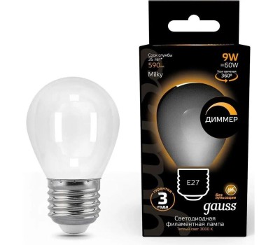 GAUSS Лампа светодиодная Filament 105202109-D 9Вт цок.:E27 шар 220B св.свеч.бел.теп. (упак.:10шт)