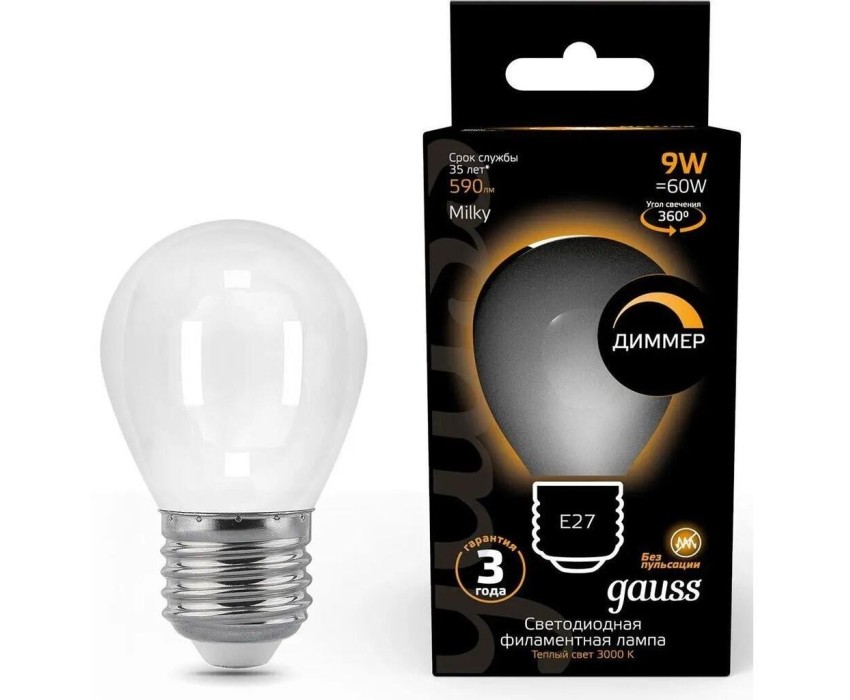 Тип товара: светодиодная Бренд: GAUSS PartNumber/Артикул Производителя: 105202109-D Модель: 105202109-D Световой поток: 590 lm Максимальный срок службы: 35000 ч Угол светового пучка: 360 ° Энергосберегающая: ДА Класс энергоэффективности: A+ Серия: Filament Патрон: E27 Количество ламп: 10 шт Цветовая температура: 3000 К Диммер: ДА Цвет свечения: белый теплый Индекс цветопередачи: 90 Тип лампы: светодиодная Степень защиты: IP20 Мощность: 9 Вт Вес упаковки (ед): 0.344 кг Габариты упаковки (ед) ДхШхВ: 0.345x0.05x0.085 м Объем упаковки (ед): 0.00146625 м3 Напряжение питания: 220 В