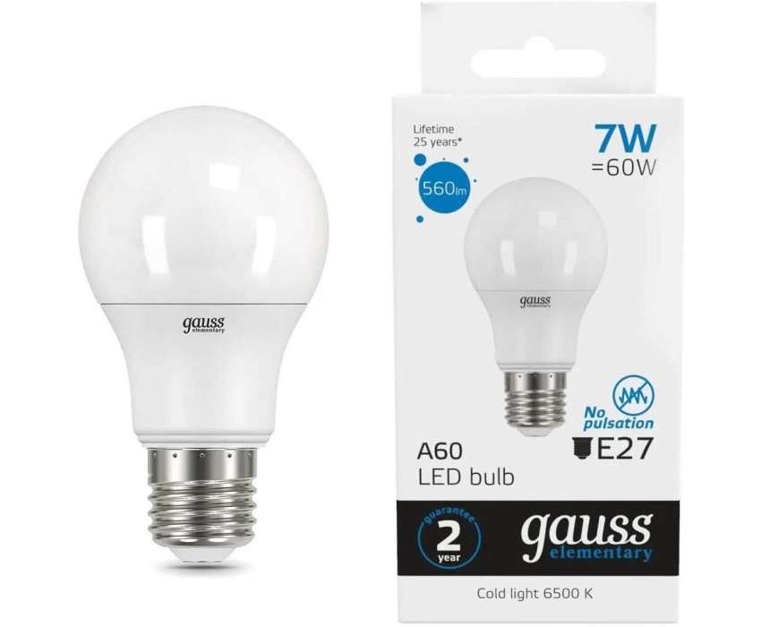 GAUSS Лампа светодиодная Elementary 7Вт цок.:E27 груша 220B св.свеч.бел.нейт. A60 (упак.:10шт) (23227A)