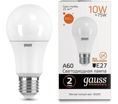 GAUSS Лампа светодиодная Elementary 10Вт цок.:E27 груша 220B св.свеч.бел.теп. A60 (упак.:10шт) (23210)