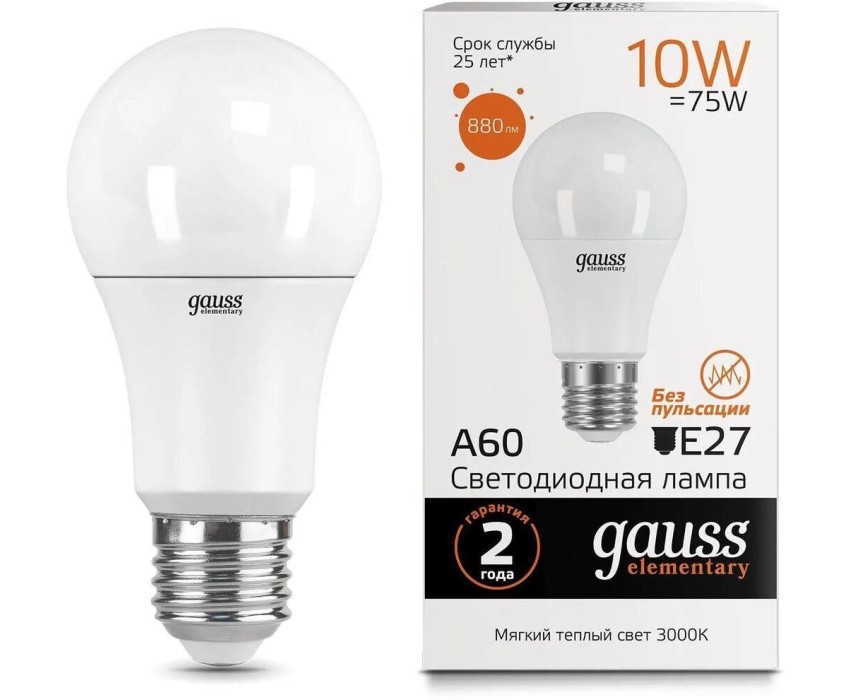 Бренд: GAUSS Колба: A60 Тип товара: светодиодная PartNumber/Артикул Производителя: 23210 Энергосберегающая: ДА Класс энергоэффективности: A+ Матовая: ДА Описание: Светодиодная лампа Gauss - безопасный для здоровья и окружающей среды источник света. Она не пульсирует, мгновенно включается, не содержит ртути и имеет больший срок службы, чем лампы накаливания и КЛЛ, экономичнее ламп накаливания до 10 раз. Световой поток: 880 lm Максимальный срок службы: 25000 ч Угол светового пучка: 240 ° Вес упаковки (ед): 0.6 кг Серия: Elementary Патрон: E27 Количество ламп: 10 шт Цветовая температура: 3000 К Цвет свечения: белый теплый Индекс цветопередачи: 80 Тип лампы: светодиодная Степень защиты: IP20 Мощность: 10 Вт Габариты упаковки (ед) ДхШхВ: 0.3x0.215x0.06 м Объем упаковки (ед): 0.00387 м3 Напряжение питания: 220 В