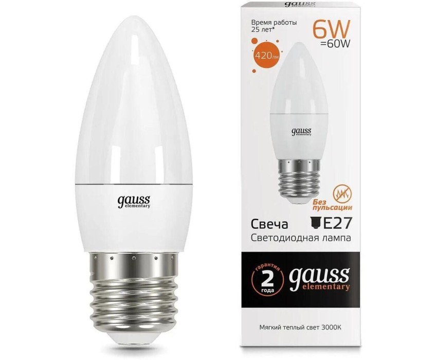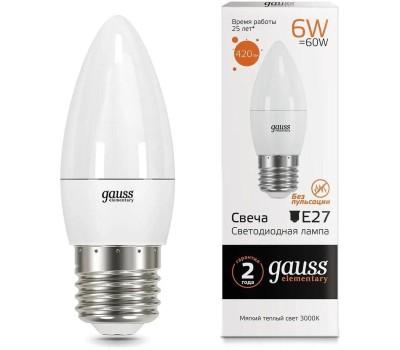 GAUSS Лампа светодиодная Elementary 6Вт цок.:E27 свеча 220B св.свеч.бел.теп. C37 (упак.:10шт) (33216)