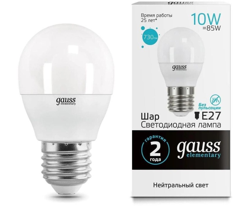 GAUSS Лампа светодиодная Elementary 10Вт цок.:E27 шар 220B св.свеч.бел.нейт. (упак.:10шт) (53220)