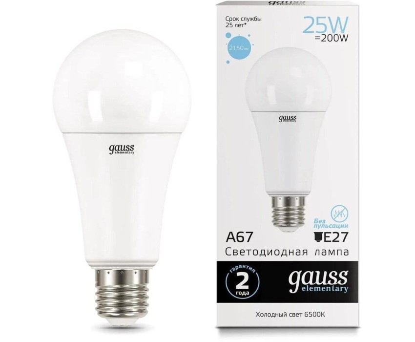 GAUSS Лампа светодиодная Elementary 25Вт цок.:E27 груша 220B св.свеч.бел.хол. A67 (упак.:10шт) (73235)