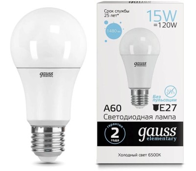GAUSS Лампа светодиодная Elementary 15Вт цок.:E27 груша 220B св.свеч.бел.хол. A60 (упак.:10шт) (23235)