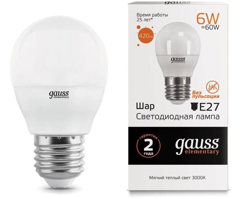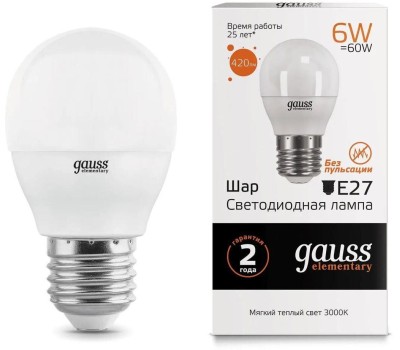 GAUSS Лампа светодиодная Elementary 6Вт цок.:E27 шар 220B св.свеч.бел.теп. (упак.:10шт) (53216)