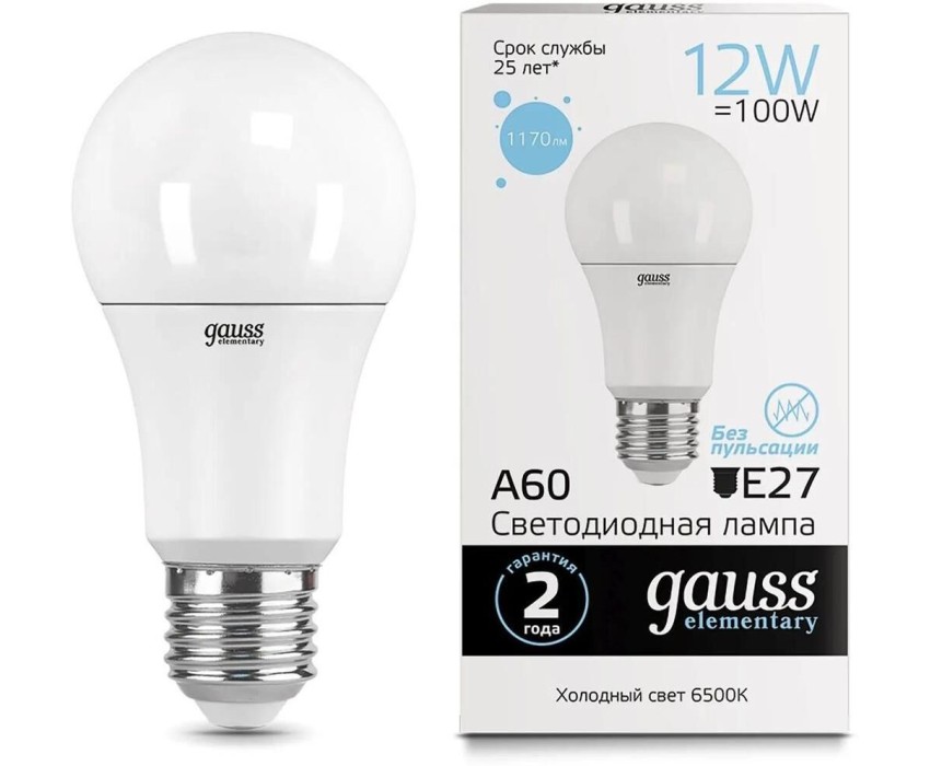 GAUSS Лампа светодиодная Elementary 12Вт цок.:E27 груша 220B св.свеч.бел.хол. A60 (упак.:10шт) (23232)