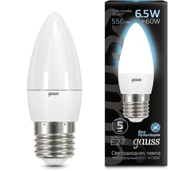 GAUSS Лампа светодиодная 6.5Вт цок.:E27 свеча 220B св.свеч.бел.нейт. (упак.:10шт) (103102207)