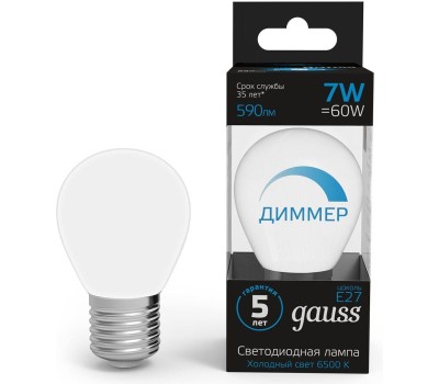 GAUSS Лампа светодиодная 105102307-D 7Вт цок.:E27 шар 150B св.свеч.бел.хол. (упак.:1шт)